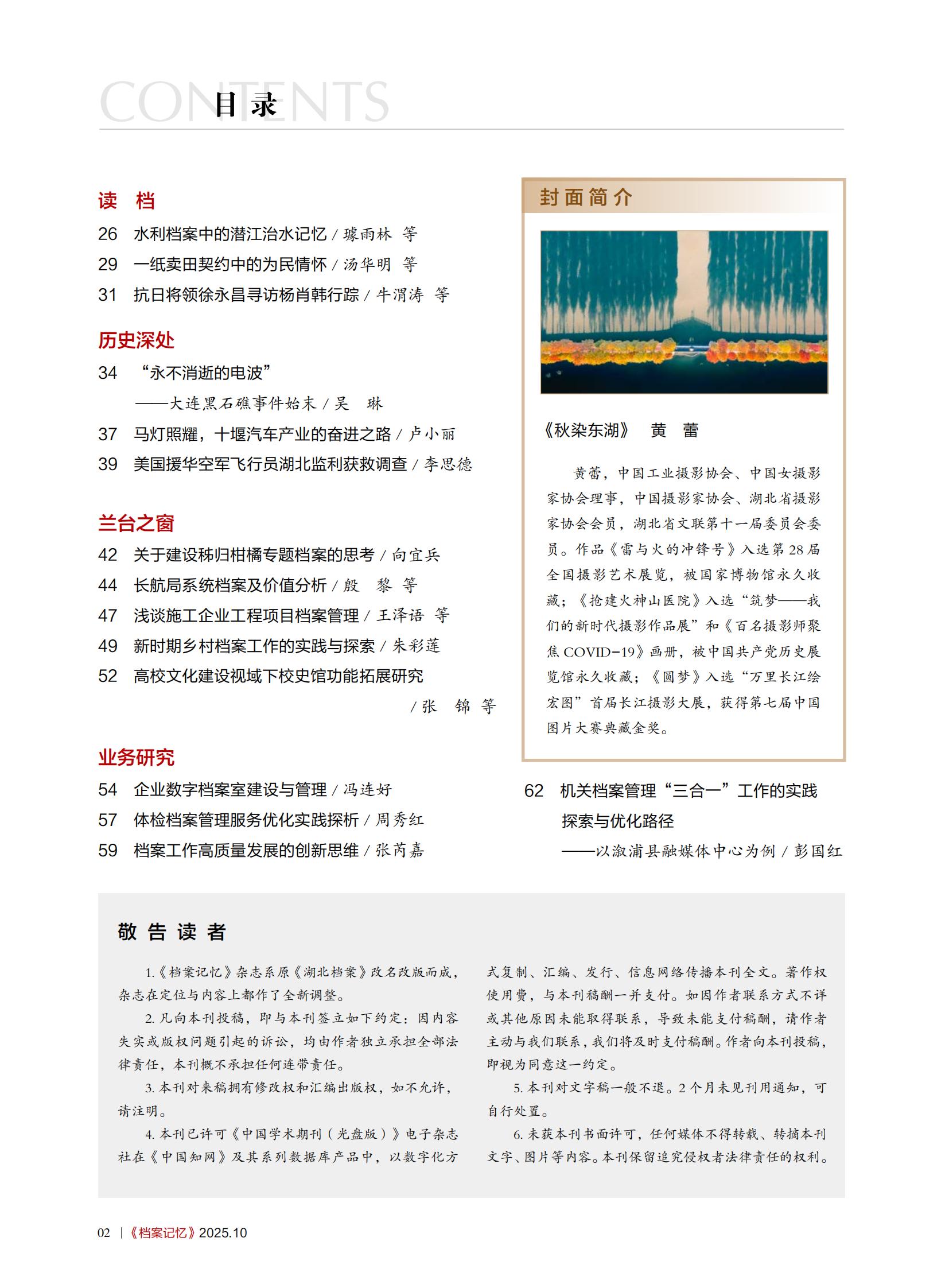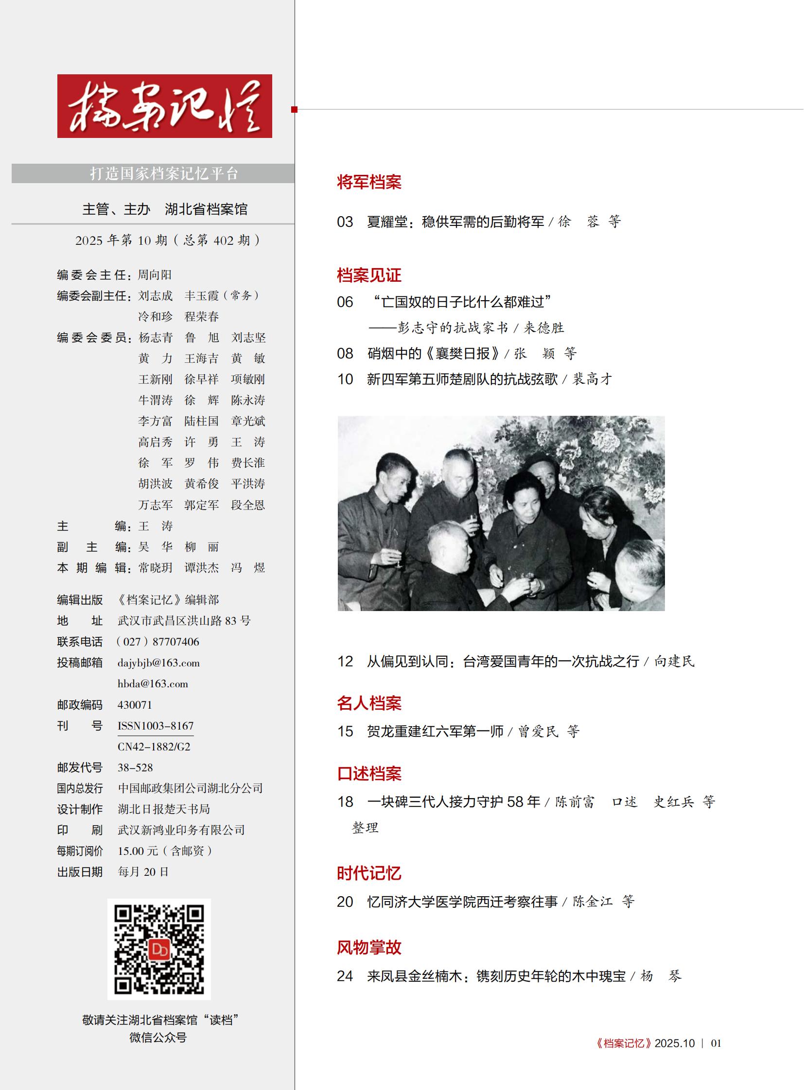 《档案记忆》杂志是湖北省档案馆主管、主办的省优秀期刊,创刊于 1986 年,是全省唯一具有公开刊号的档案专业类杂志,也是湖北省档案馆“一库一展一讲一刊”红色档案品牌之一,具有广泛的社会影响力和工作指导性。 投稿及订阅咨询:027-87707406。 投稿邮箱:dajybjb@163.com;hbda@163.com。