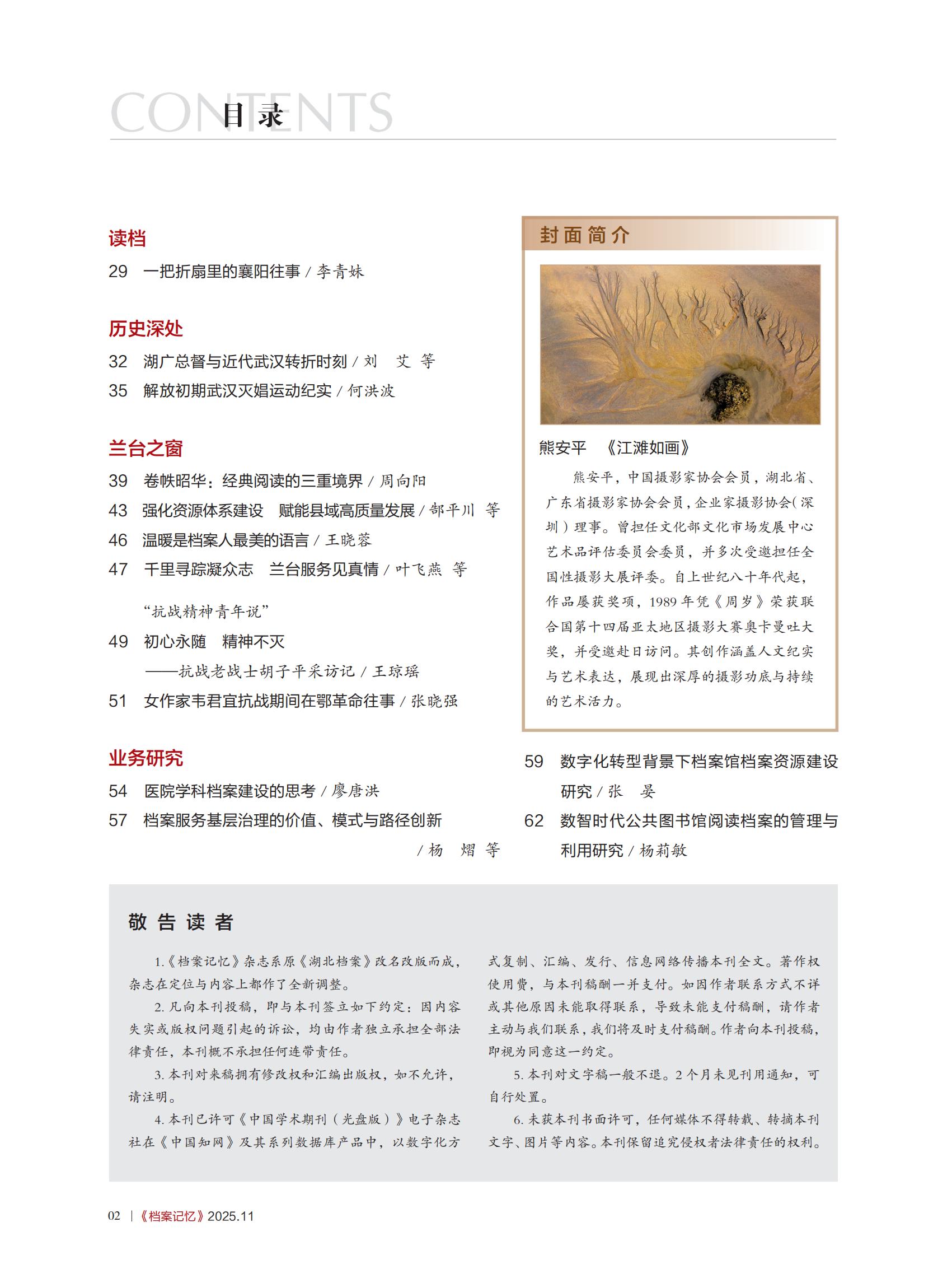 《档案记忆》杂志是湖北省档案馆主管、主办的省优秀期刊,创刊于 1986 年,是全省唯一具有公开刊号的档案专业类杂志,也是湖北省档案馆“一库一展一讲一刊”红色档案品牌之一,具有广泛的社会影响力和工作指导性。 投稿及订阅咨询:027-87707406。 投稿邮箱:dajybjb@163.com;hbda@163.com。