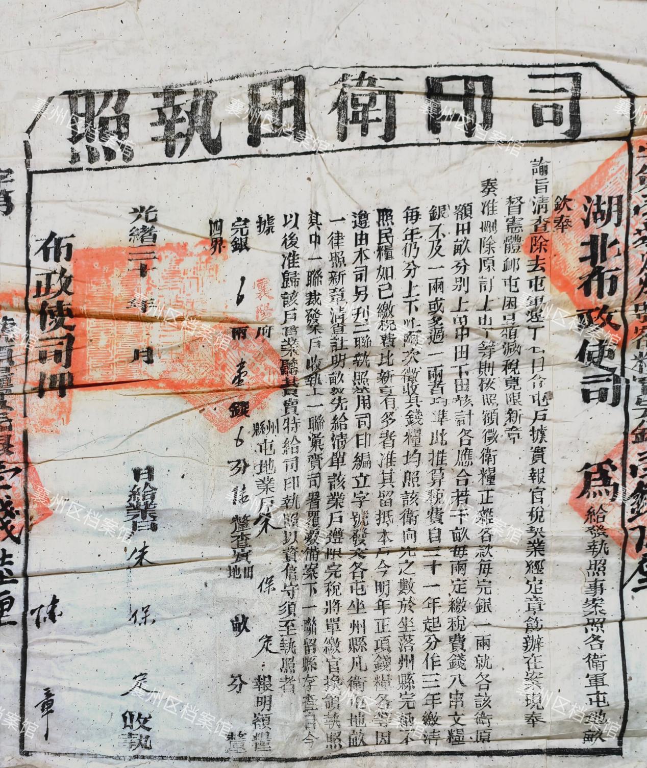 12月15日,襄阳市公安局襄州区分局朱集派出所将5份清代光绪三十年(1904年)的司印卫田执照捐赠给襄州区档案馆,该执照由湖北布政使司襄阳府颁发,为给发执照事案照各卫军屯地亩,内容为减税宽限新章,即删除原订的按照上田中田下田核计征收等,改为每年分上下两次征收钱粮,已缴税费者比新章有多者,准其留抵今明年正项钱粮各等,由布政使司刊三联执照,一联裁发业户收执,上一联由司署备案,下一联由县存查。
