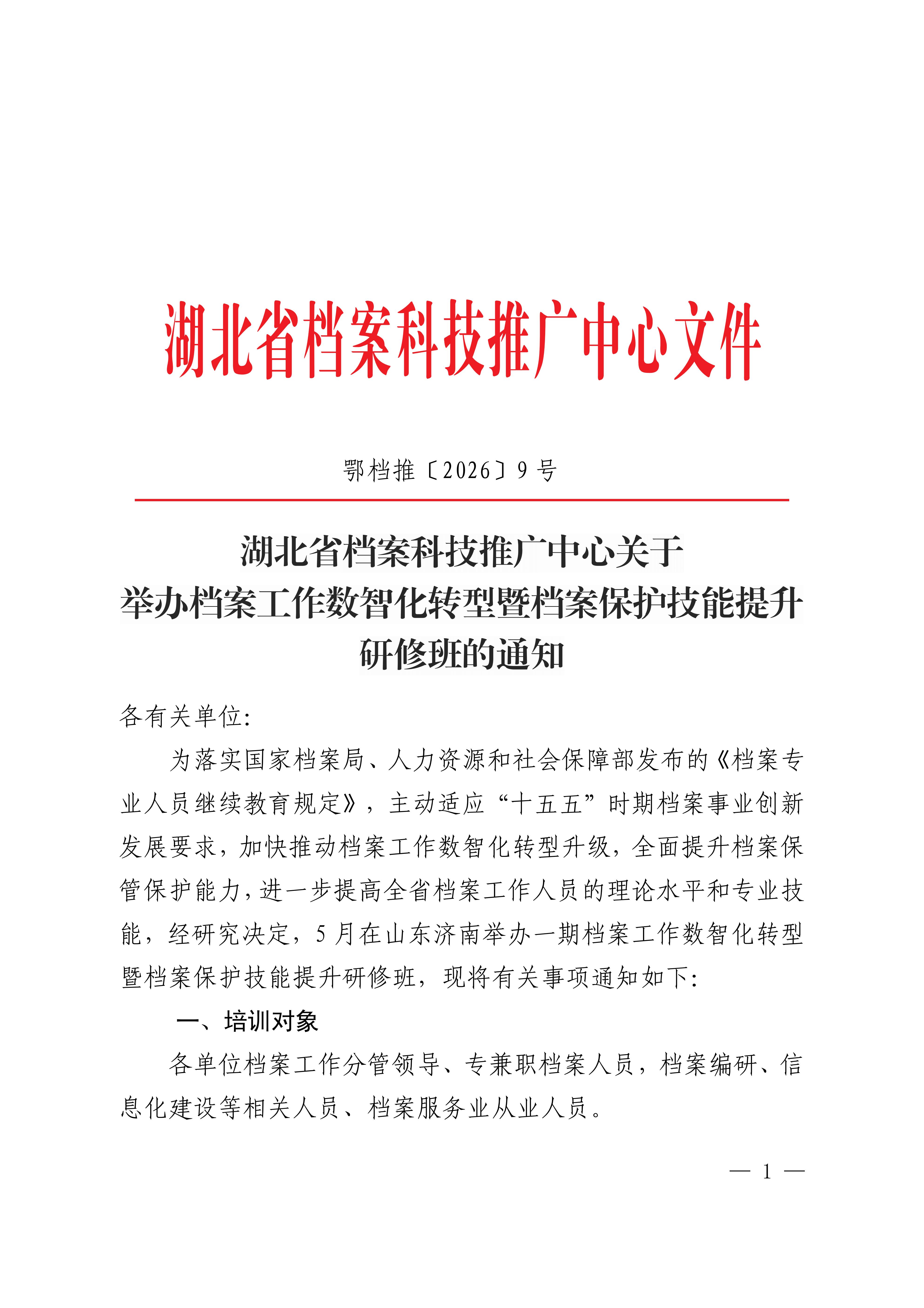 湖北省档案科技推广中心关于举办档案工作数智化转型暨档案保护技能提升研修班的通知