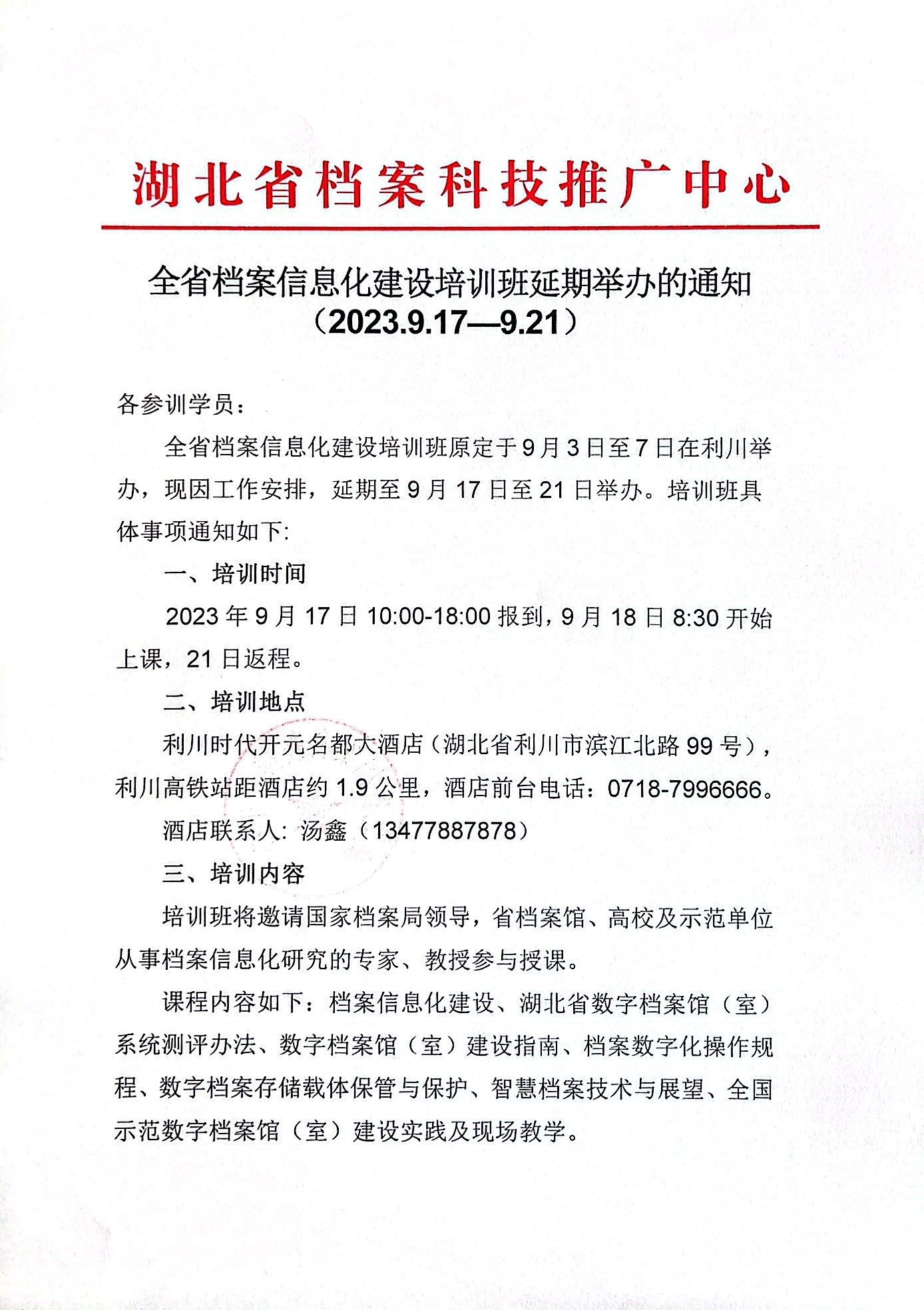全省档案信息化建设培训班延期举办的通知 (2023.9.17—9.21)