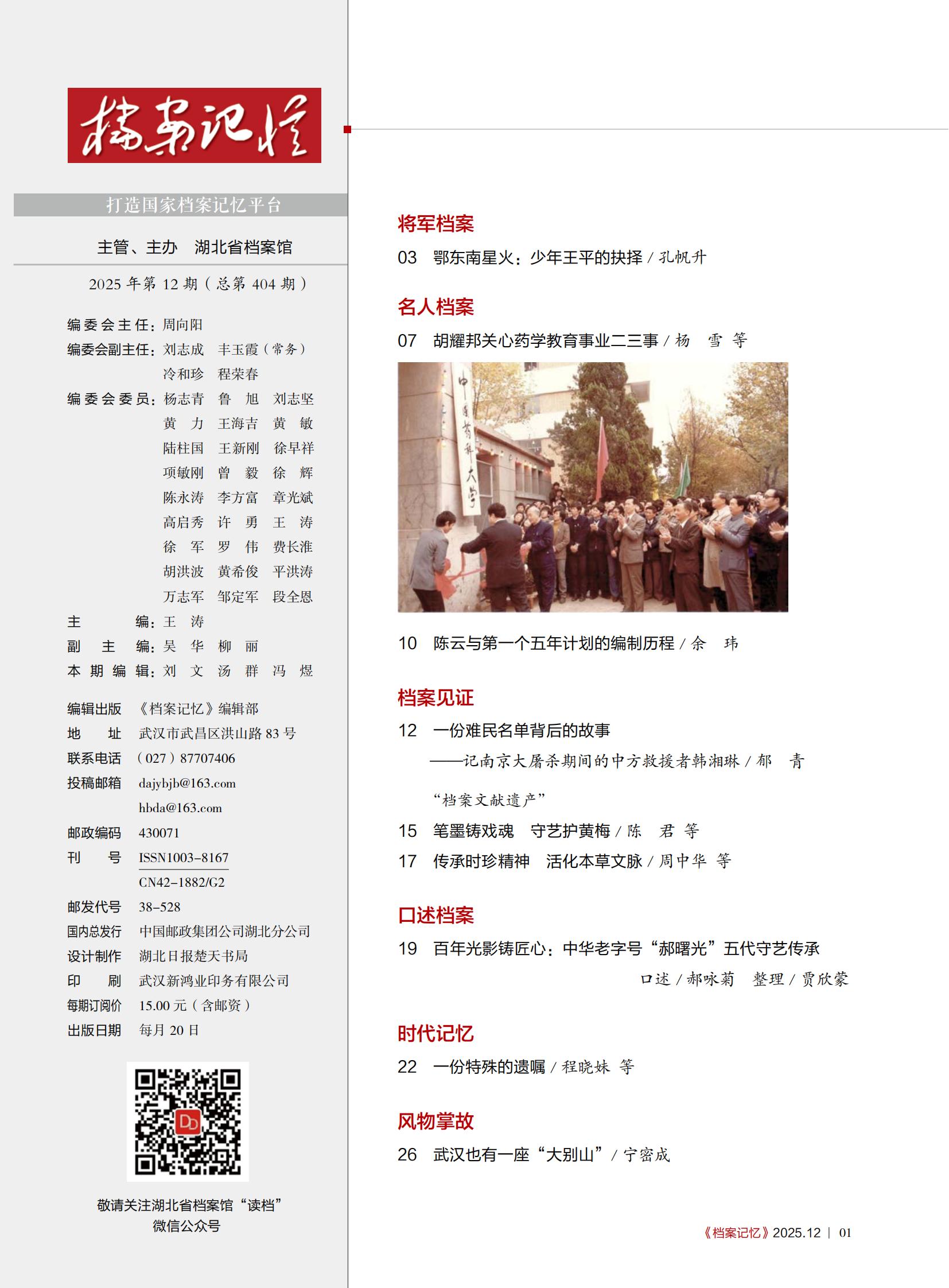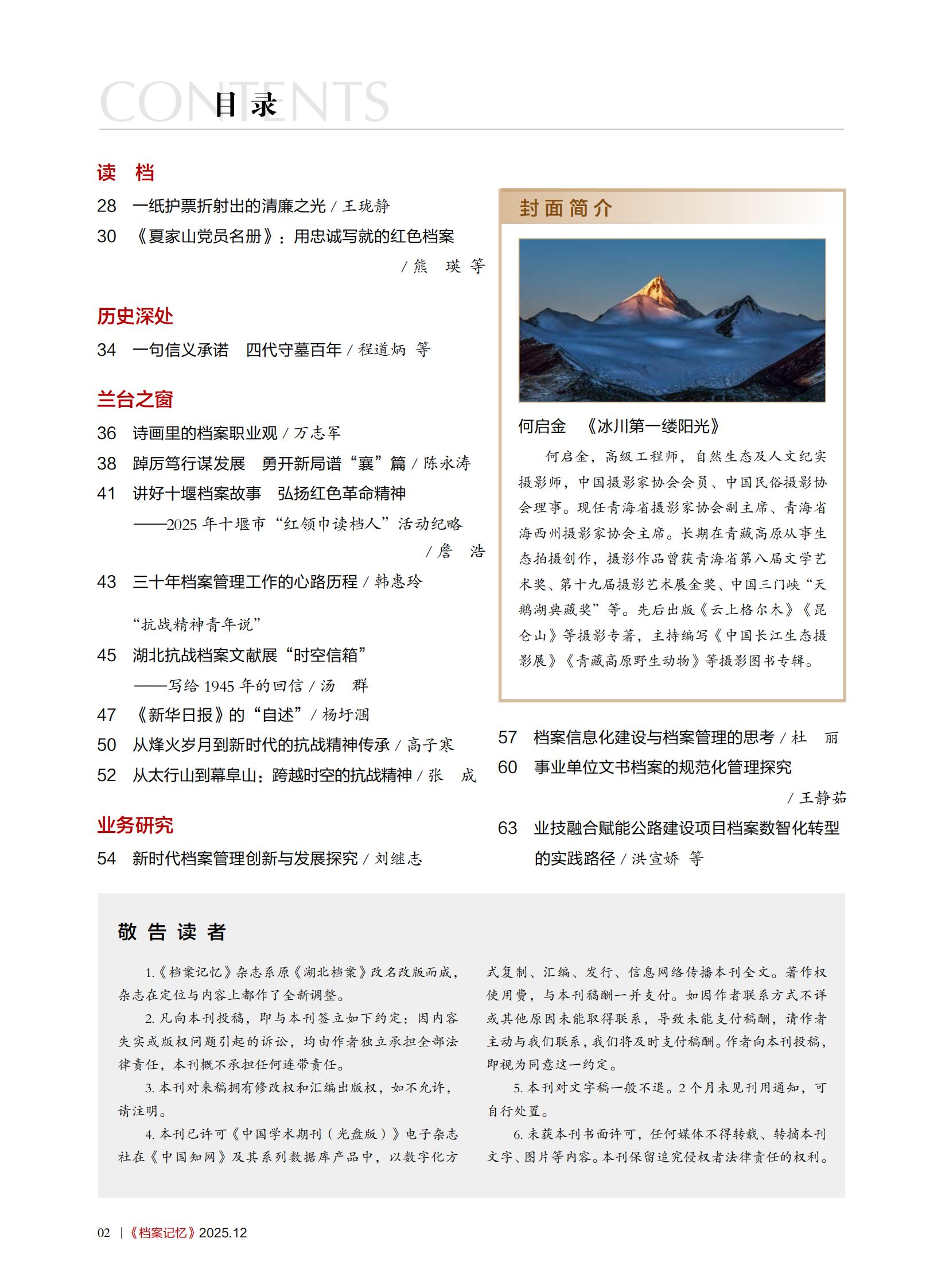 《档案记忆》杂志是湖北省档案馆主管、主办的省优秀期刊,创刊于 1986 年,是全省唯一具有公开刊号的档案专业类杂志,也是湖北省档案馆“一库一展一讲一刊”红色档案品牌之一,具有广泛的社会影响力和工作指导性。 投稿及订阅咨询:027-87707406。 投稿邮箱:dajybjb@163.com;hbda@163.com。