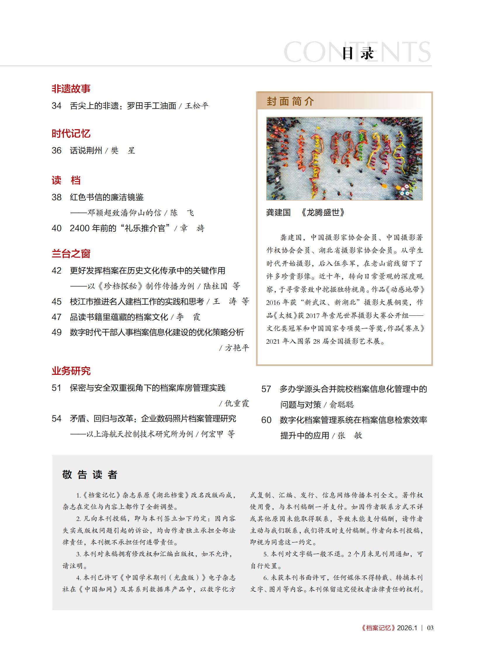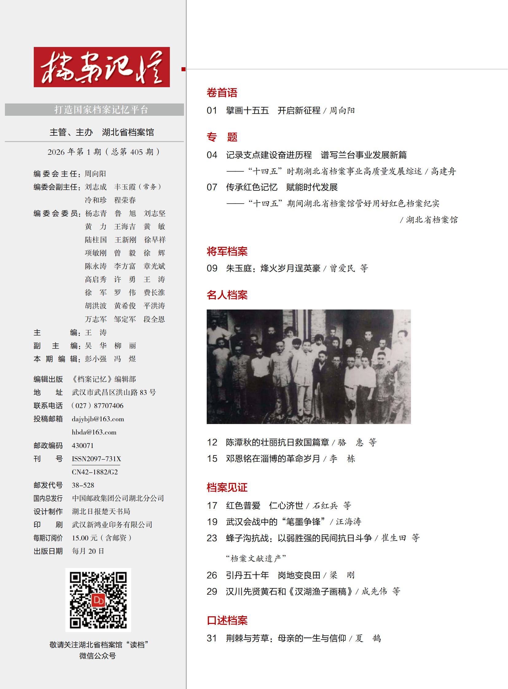 《档案记忆》杂志是湖北省档案馆主管、主办的省优秀期刊,创刊于 1986 年,是全省唯一具有公开刊号的档案专业类杂志,也是湖北省档案馆“一库一展一讲一刊”红色档案品牌之一,具有广泛的社会影响力和工作指导性。 投稿及订阅咨询:027-87707406。 投稿邮箱:dajybjb@163.com;hbda@163.com。