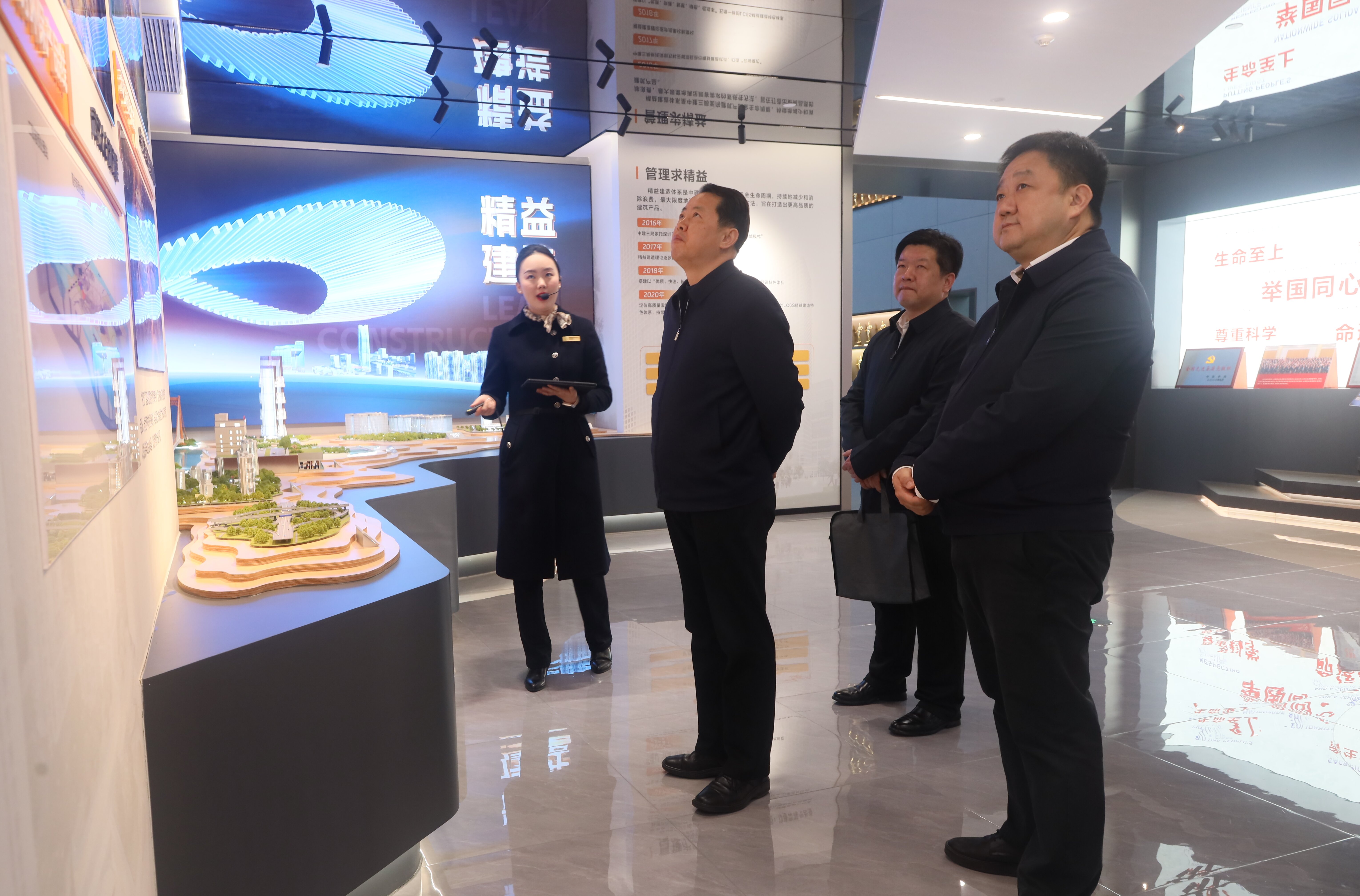 周向阳一行先后参观了中建三局中国建筑科技馆、“两山”医院建设纪实展、企业展厅及档案库房,详细了解企业在重大工程建设、智能建造、档案管理等方面的实践成果。周向阳对中建三局在建筑行业取得的突出业绩和过硬队伍表示赞赏,对其档案工作体系化建设、规范化管理、特色化开发取得的成效给予充分肯定。他指出,重大工程项目档案是记录支点建设历程、服务国家重大战略的珍贵历史财富。中建三局作为大型中央在鄂企业,始终奋战在支点建设主战场,以精品工程支撑发展大局,以优质档案留存奋斗印记,其档案工作与建设实践同频共振,充分体现了行业排头兵的时代担当。
