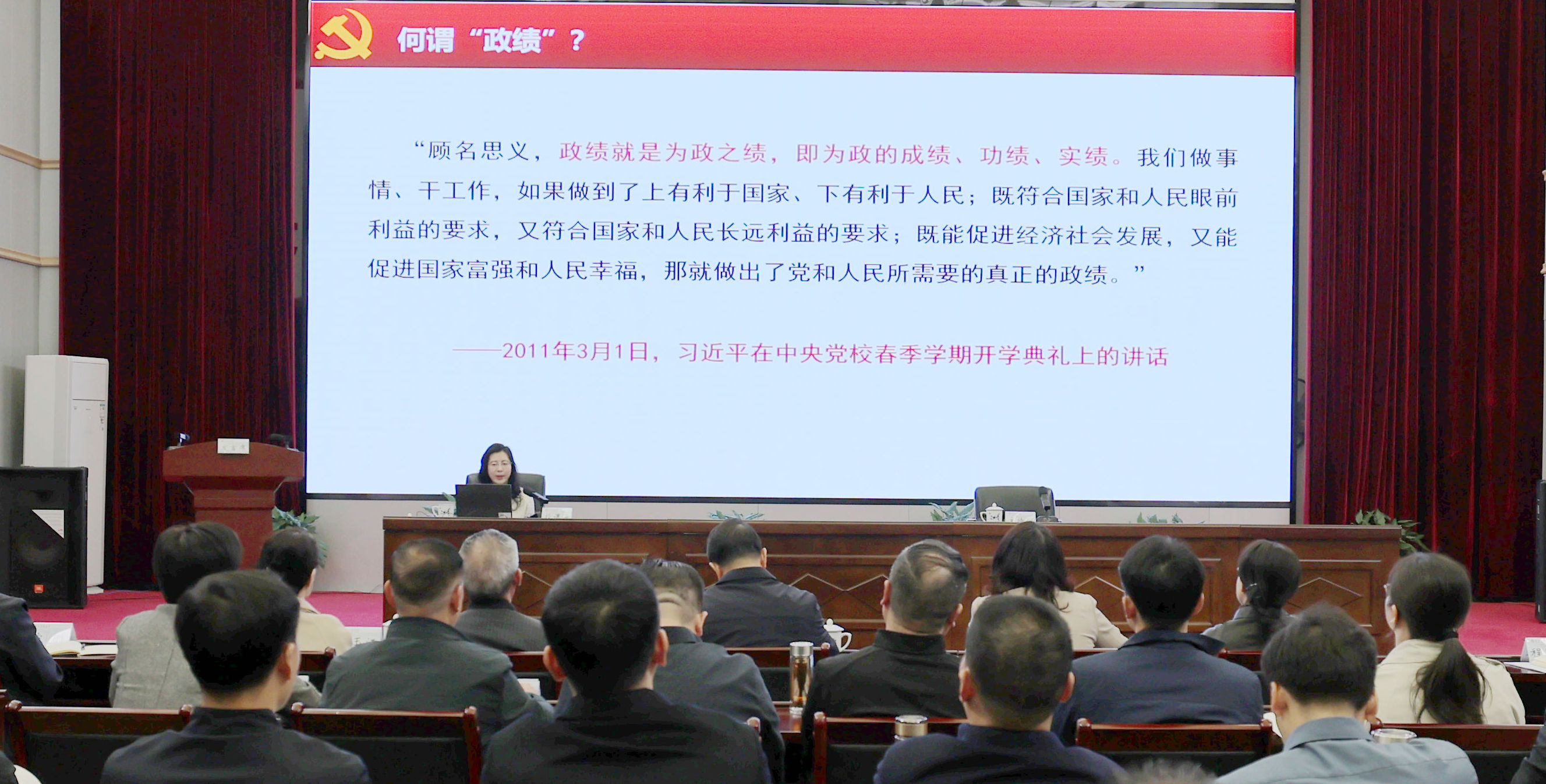 31日上午,读书班邀请省委党校江雨副教授作专题辅导授课,从树立和践行正确政绩观的重大意义、主要内容、实践路径三个方面开展系统阐释,为党员干部深化理解、对标践行提供有力指导。随后开展研讨交流活动,3名党员干部代表围绕“什么是正确政绩观、为谁创造政绩、怎样创造政绩”主题,结合岗位职责和工作实际作交流发言,谈认识、讲体会、亮态度,为全体党员干部树立标杆、作出示范。