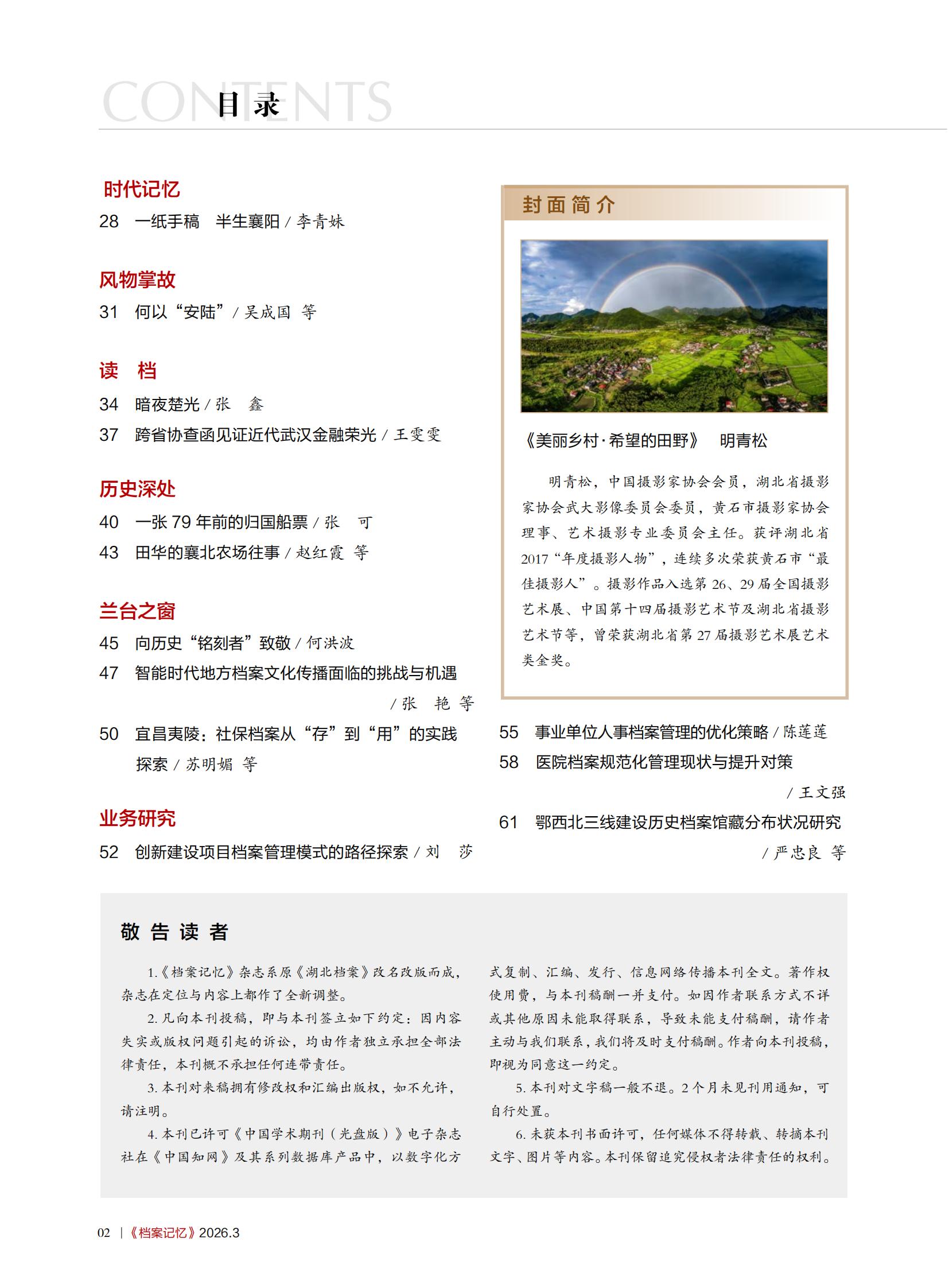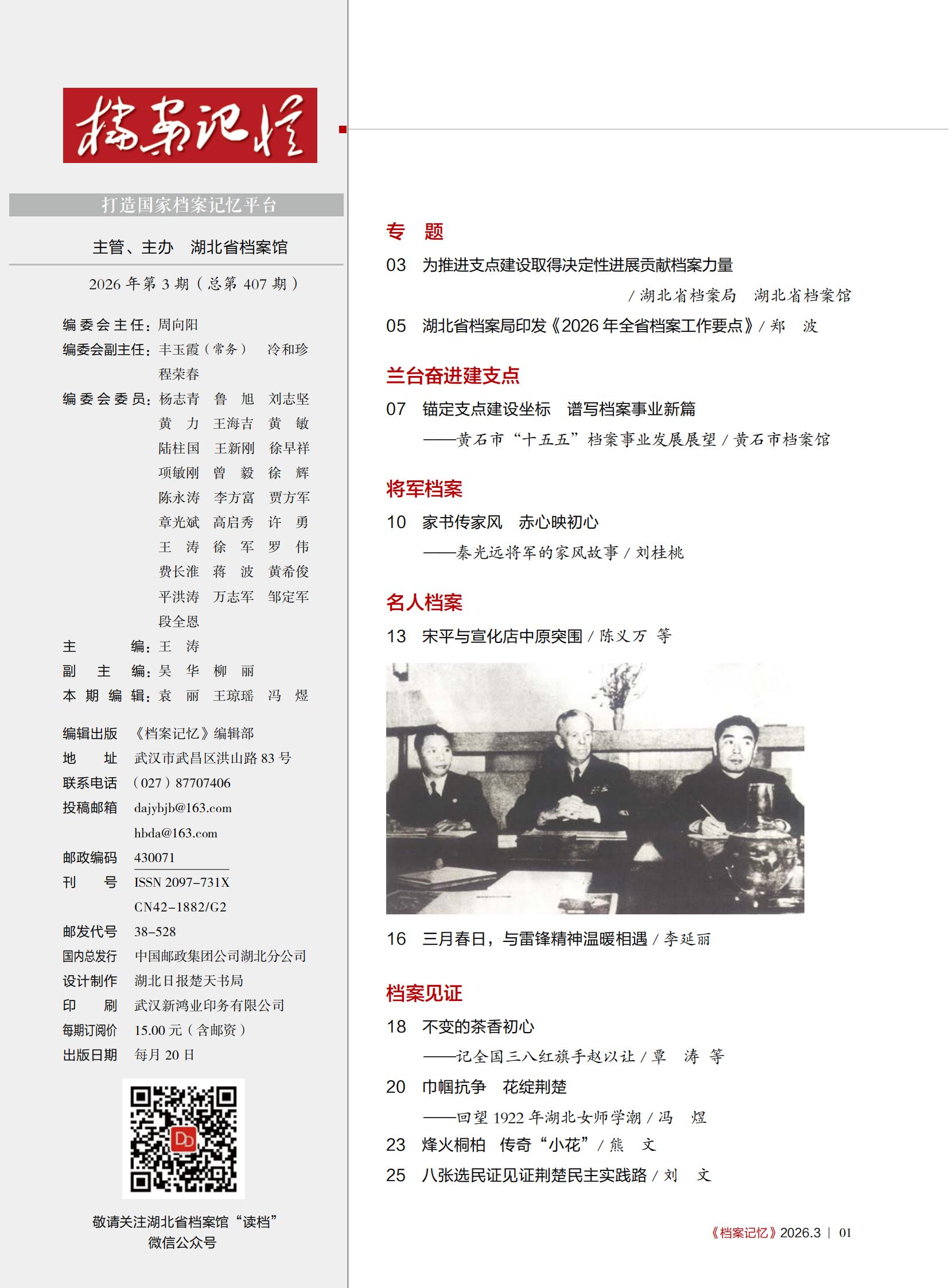 《档案记忆》杂志是湖北省档案馆主管、主办的省优秀期刊,创刊于 1986 年,是全省唯一具有公开刊号的档案专业类杂志,也是湖北省档案馆“一库一展一讲一刊”红色档案品牌之一,具有广泛的社会影响力和工作指导性。 投稿及订阅咨询:027-87707406。 投稿邮箱:dajybjb@163.com;hbda@163.com。